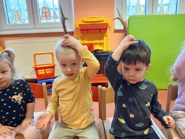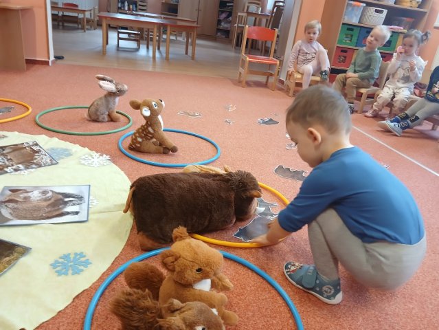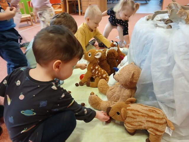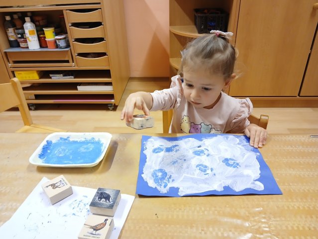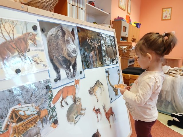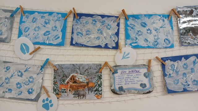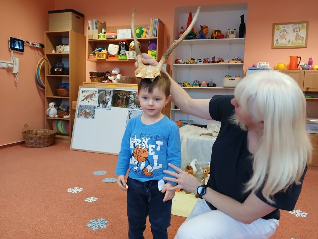 O zvířátkách zpíváme, hledáme je podle stop, stavíme jim pelíšky a zkoumáme opravdové trofeje. Tančíme, malujeme, tiskáme a tvoříme.