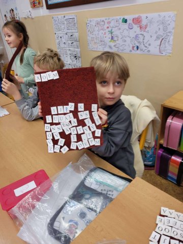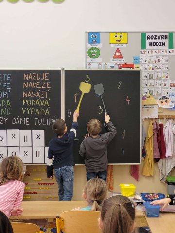 Naši předškoláci navštívili ZŠ U Lesa. Potkali se tam se svými kamarády ze školky a vyzkoušeli si, jaké to je sedět v opravdové školní lavici. Na pozvání paní učitelky si také zkusili pracovat u tabule a na chvíli se tak ocitli v roli skutečných školáků.