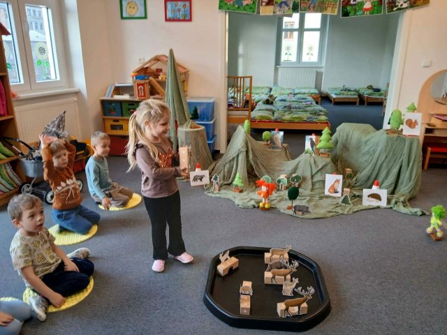 Děti si povídaly o tom, kdo všechno v lese žije a kdo se o něj stará. Společně jsme pozorovali