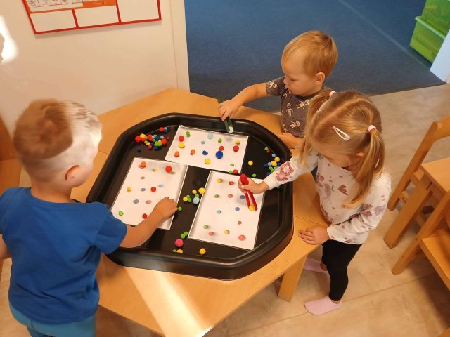 Děti ze třídy Sluníčko během prvních dnů ve školce poznávaly tváře nových kamarádů a učily se rozpoznat svou značku. Seznamovaly se s novým prostředím školky, objevovaly nové hračky, cvičily, malovaly i zpívaly.