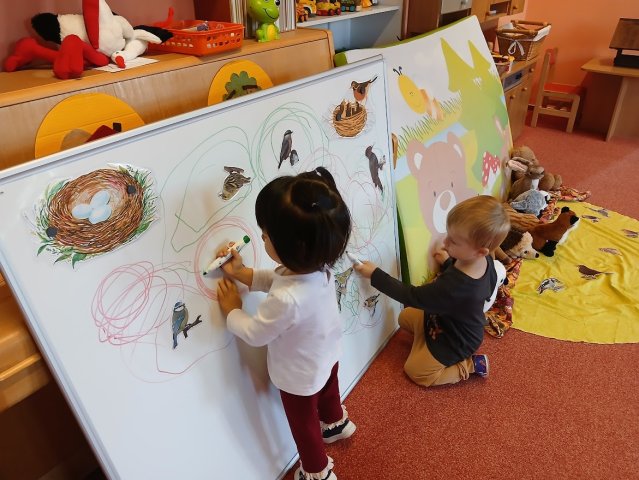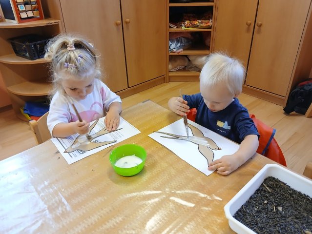 překážky, tiskali a nadšeně tvořili ze zrníček a semínek. Venku jsme pak ptáčky pozorovali a sypali jim dobrůtky.