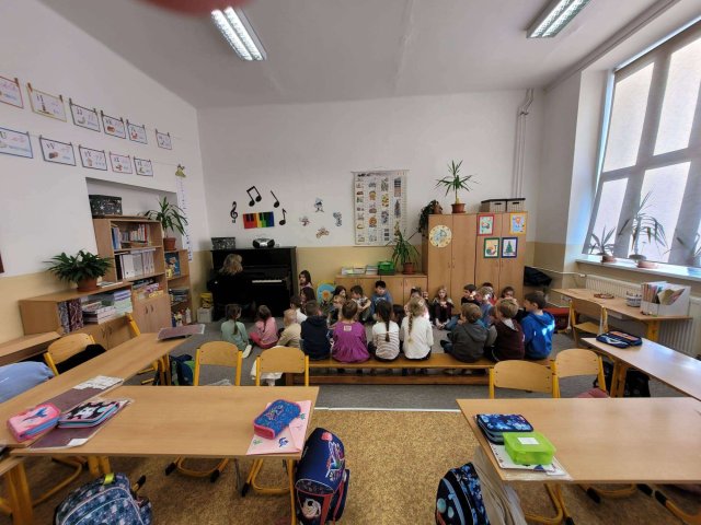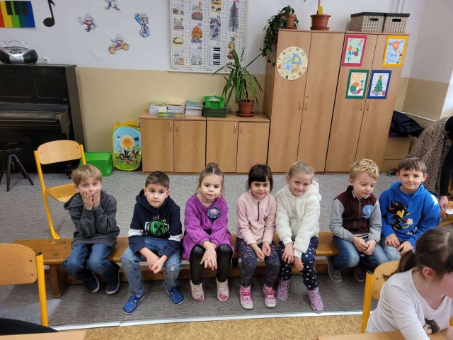 Naši předškoláci navštívili ZŠ U Lesa. Potkali se tam se svými kamarády ze školky a vyzkoušeli si, jaké to je sedět v opravdové školní lavici. Na pozvání paní učitelky si také zkusili pracovat u tabule a na chvíli se tak ocitli v roli skutečných školáků.