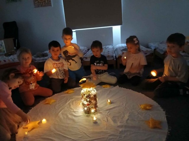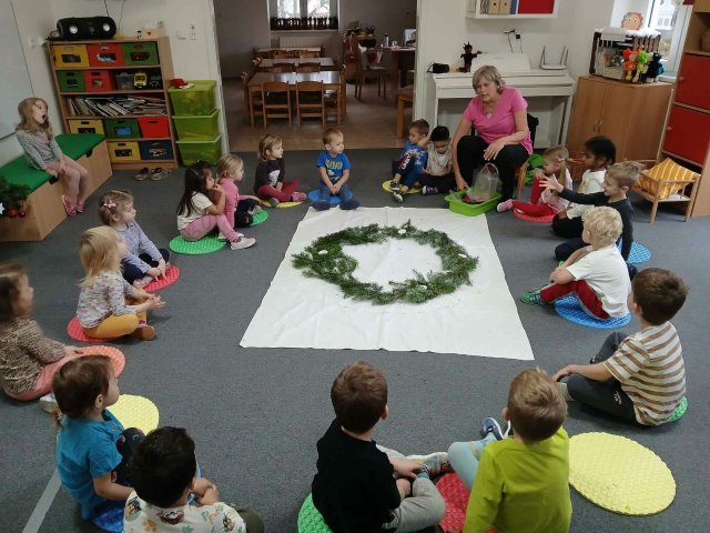 Postavili jsme si společně adventní věnec z větviček "zapalujeme" na něm svíčky - jednu vždy každý adventní týden. Zdobili jsme vánočně celou školku.