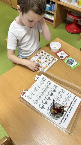 V říjnu jsme se věnovali podzimu kolem nás. První část měsíce jsme zkoumali ovoce a zeleninu všemi smysly, upevňovali jsme předložky a počty. V druhé polovině října jsme pozorovali zabarvené listí, padající listí ze stromů, mlhavé počasí, déšť a mnoho dalších znaků podzimu. Procvičovali jsme grafomotoriku a vzájemnou spolupráci při plnění různých úkolů. Společně jsme upevňovali již naučené a přidali k tomu nové písně a říkadla.